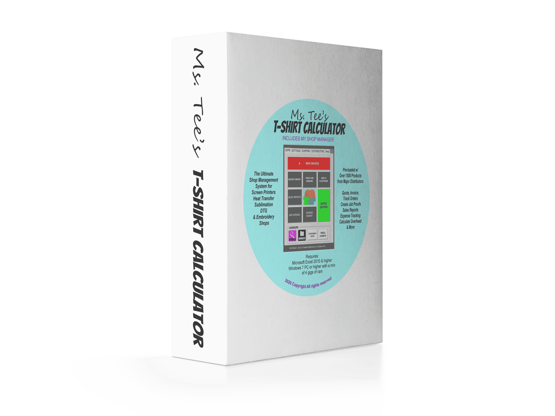 \nMy Screen Printing Calculator is the ultimate pricing software for T-Shirt Printers, Screen Printing Shop, DTG Printers, and can be easily modified to fit any print shop's needs. Learn how to price custom t-shirts in seconds. You will even be able to instantly provide pricing sheets to your t-shirt customers using my t-shirt calculator and shop management system. Ms. Tee's T-Shirt Pricing Calculator (now with shop manager)was created by Screen Printers for Screen Printers! Finally a solution just for